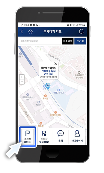 메인의 주차공간 남아요와 하단의 주차공간 남아요을 클릭하여 해당 메뉴로 이동할 수 있습니다.